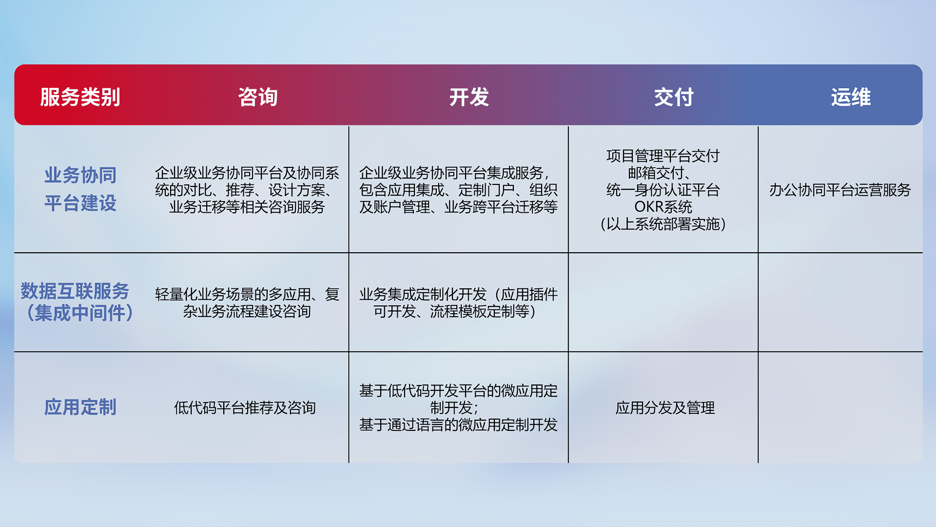 针对钉钉、、、企微、、、、IDaas等平台级产品提供产品的规划、、、方案、、交付、、定制化开发等服务,,,实现如统一协同办公、、智能客户服务、、、、混合会议管理、、、智能数据查询、、等业务场景,,实现数字化转型。。。