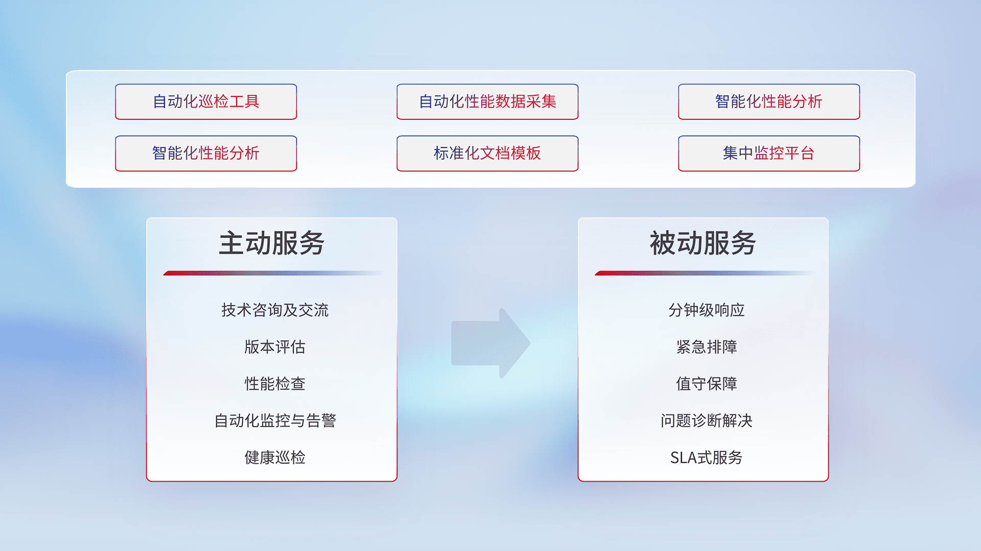 智能化工具和标准化文档,,保障服务质量,,提供主动服务(包含技术咨询、、、版本评估、、性能检查、、自动化监控与告警、、、健康巡检)和被动服务包含(分钟级响应、、、、紧急排障、、、值守保障、、、、问题诊断解决、、、、SLA服务)。。。